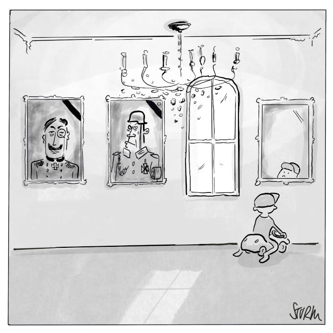 Der Leipziger Philipp Sturm erhielt den Geflügelten Bleistift in Silber, der mit 3.000 Euro dotiert ist. Das ausgezeichnete Werk „Jetzt seid ihr dran!“ verbindet den Generationenkonflikt mit den militärischen Herausforderungen unserer Zeit. Ein kleiner Junge auf einem Bobbycar blickt auf eine Ahnengalerie von gefallenen Militärs. In der Reihe hängt ein Spiegel, in den der Junge schaut. „Philipp Sturm gelingt es, den Generationenwechsel in einem starken, wortlosen Bild zu verdichten. Der Spiegel als leeres Porträt wird zur Mahnung für die nachwachsende Generation“, urteilte die Jury.